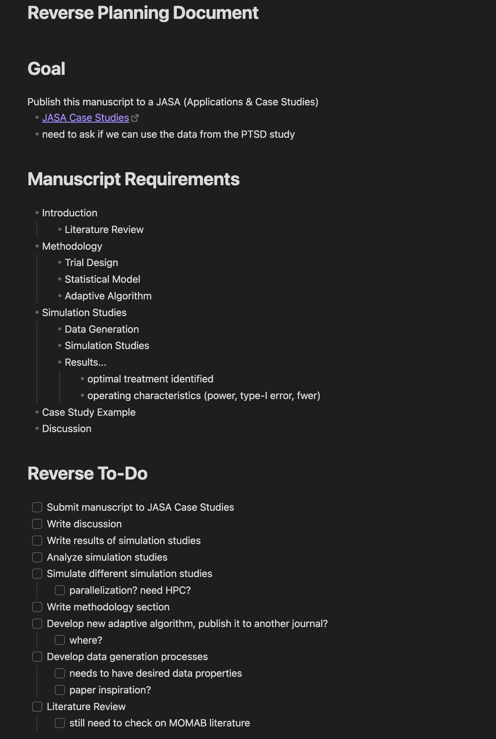 The reverse goal planning forces you to think. For the longest time, I was obsessed with the bullet point for developing a new adaptive randomization algorithm. That’s the part where I get to do exciting research and algorithm development, stuff I like doing. But to even get to that point, I need to be able to simulate data that I don’t know how to simulate yet! But to simulate the data, I should probably find a model paper to see how they do it. Trying not to reinvent the wheel will save me a lot of time.